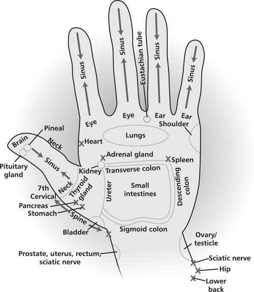 Hand reflexology uses a different technique than that used on the feet.. mainly because the hands are very flexible and the reflexes are much deeper under the skin which means you need to reach deeper and hold for longer to stimulate a hand reflexology point. When working on the fingers, it’s good to rotate them.